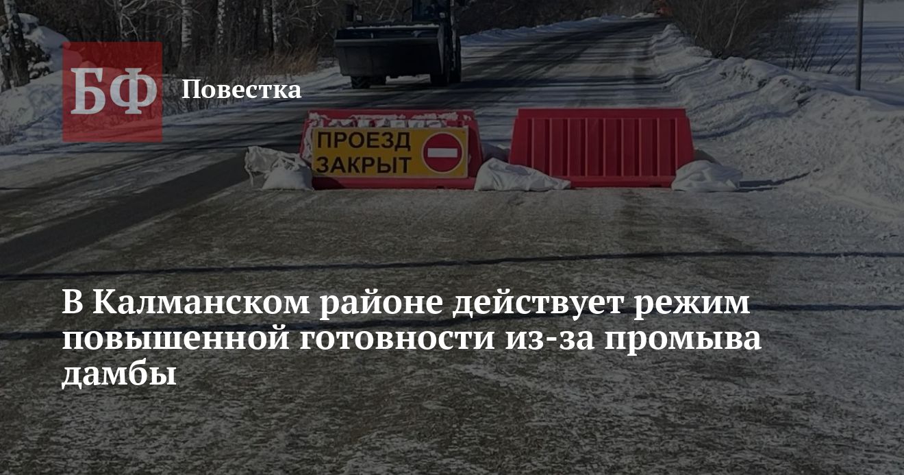 Власти Калманского района установили режим повышенной готовности из-за промыва дамбы в районе села Александровка. Как сообщила в своем Telegram-канале глава муниципалитета Ольга Чернолуцкая, на устранение последствий инцидента потребуется не меньше недели.