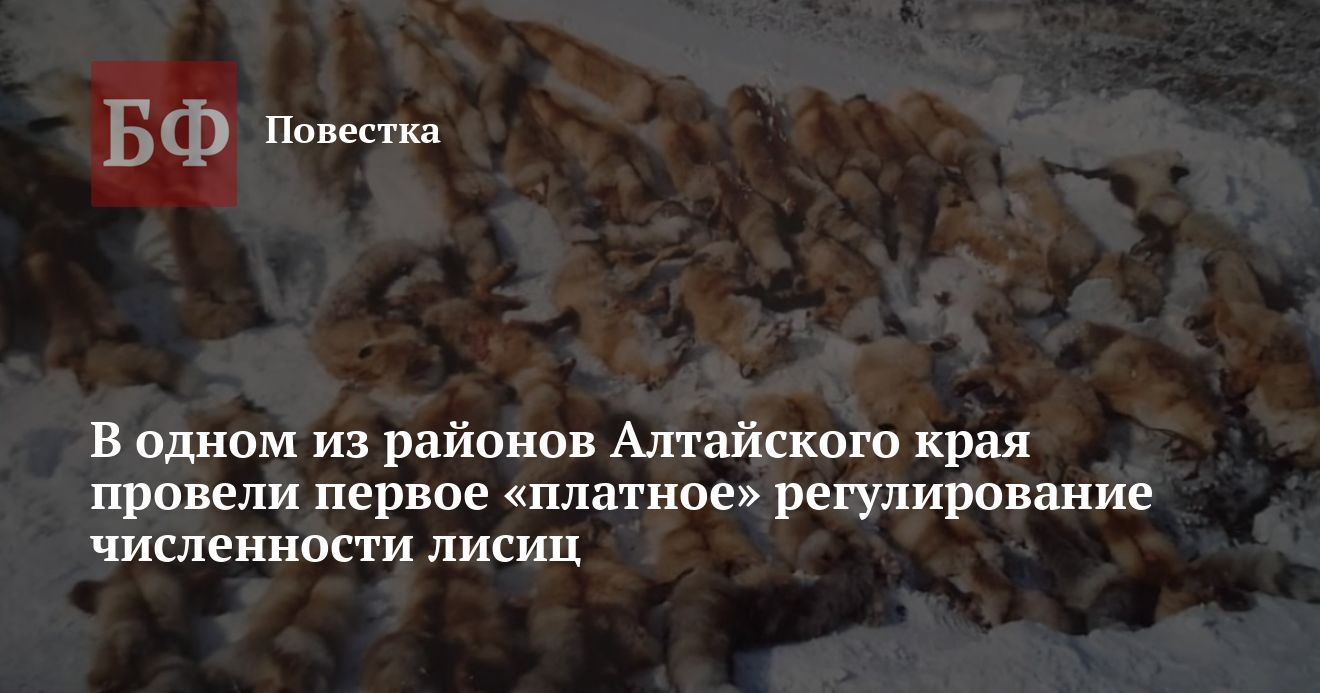 По словам собеседника, сельхозпредприятия Шелабохинского района решили ввести вознаграждение за добычу диких животных, которые являются переносчиками бешенства, чтобы оградить свой скот от опасного вируса. Была достигнута договоренность о том, что за одну голову зверя, добытого на территории хозяйства, охотникам будут платить по 1000 рублей, а за голову зверя, добытого в радиусе 5 км от населенного пункта, где базируется ферма (их 13 - в селах Новообинцево, Киприно, Крутишка и т.д.) - 500 рублей. Дополнительное вознаграждение ввело охотобщество - два патрона за одну голову. Регулирование численности проводили с 23 января по 21 февраля. Соответствующий приказ издавало Минприроды Алтайского края в связи со сложной обстановкой по бешенству.