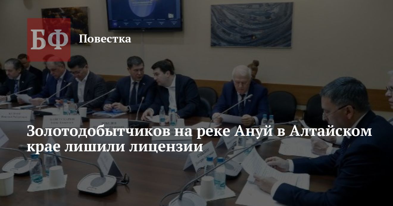 Комиссия федерального агентства по недропользованию (Роснедра) приняла решение досрочно прекратить права пользования недрами по лицензии на добычу россыпного золота в районе реки Ануй в Алтайском крае. Об этом сообщил председатель комитета Госдумы по экологии, природным ресурсам и охране окружающей среды Дмитрий Кобылкин. Вероятно, речь идет об ООО «Артель Солнечная», которое несколько лет назад работало в регионе как ООО «Ануй» в долине одноименной реки.