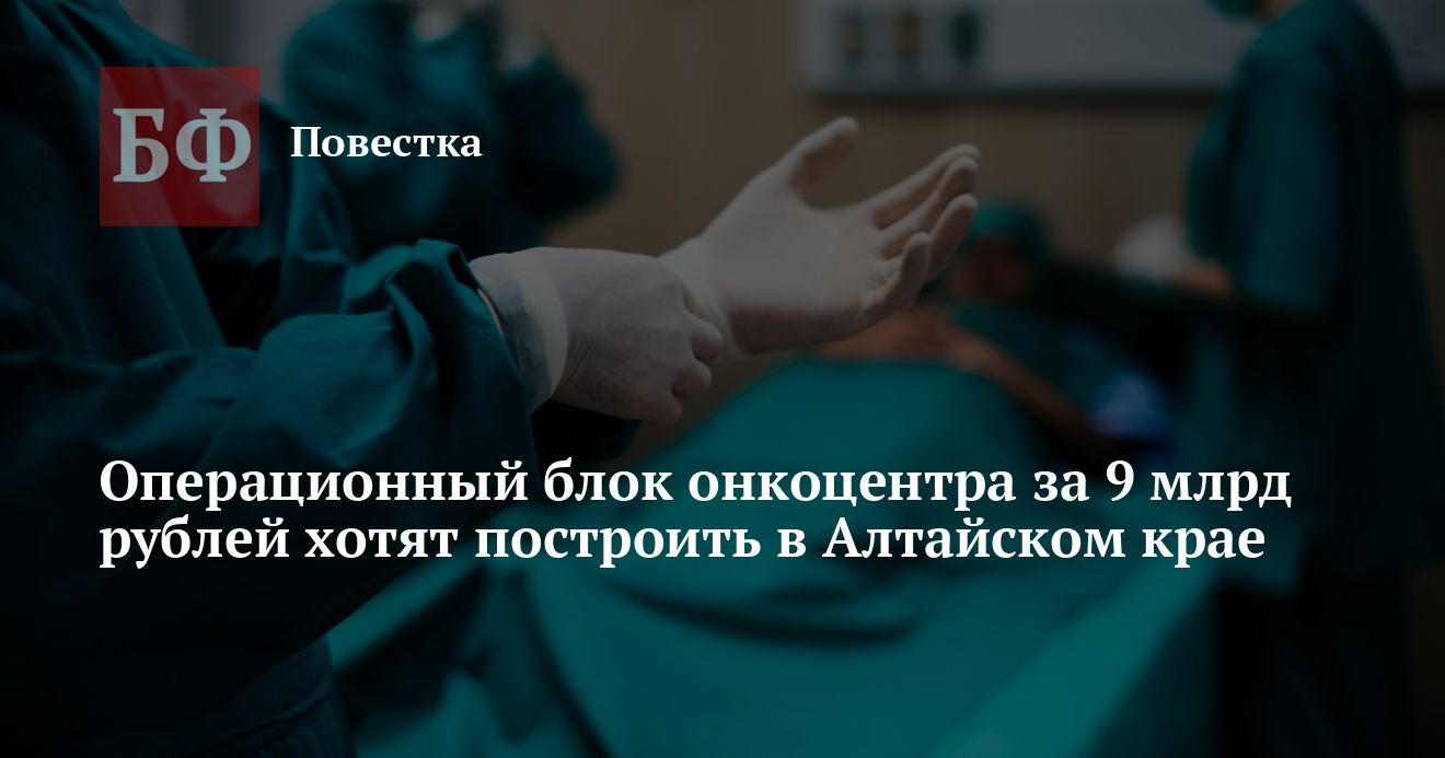 Власти Алтайского края хотят построить в региональном онкологическом диспансере крупный операционный блок. Для реализации проекта необходимо свыше 9 млрд рублей, сообщили «Банкфаксу» в пресс-службе Минздрава региона.