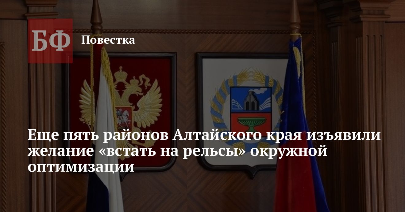 В Алтайском крае представительные органы еще трех районов поддержали преобразование муниципалитетов в округа. Речь идет о Тогульском, Кытмановском и Усть-Калманском районах, выяснил «Банкфакс». В ближайшее время озвучить свою позицию предстоит еще двум районам.