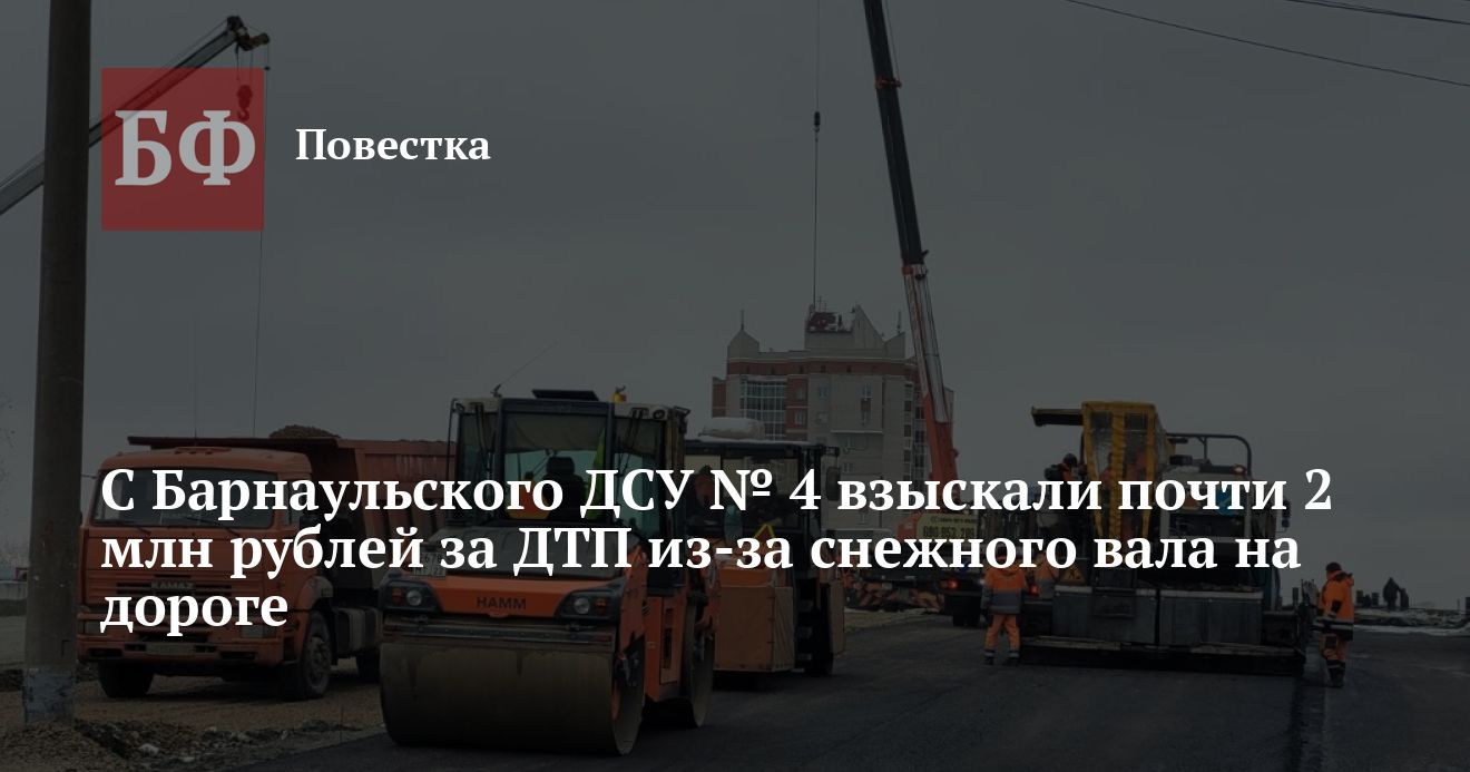 Арбитражный суд Алтайского края обязал ООО «Барнаульское ДСУ № 4» полностью компенсировать ущерб за ДТП на Павловском тракте, в которое попал большегруз. Обслуживанием этой трассы компания занималась по контракту с ФКУ Упрдор «Алтай». Как установил суд, и заказчик, и подрядчик должным образом не выполняли свои обязательства, но 1,8 млн рублей взыскали именно с ДСУ, следует из судебных материалов.
