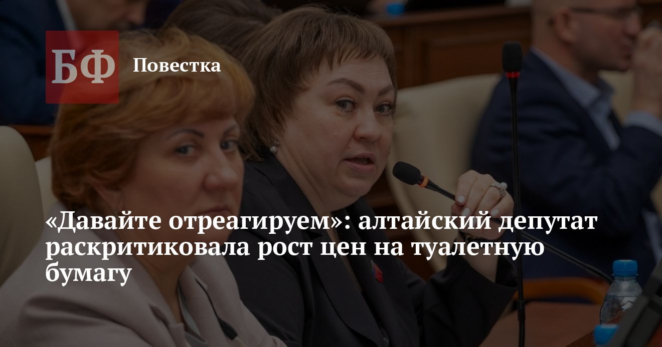 Депутат Алтайского Заксобрания Евгения Боровикова призвала принять меры по сдерживанию роста цен на базовые товары и услуги, особенно ее озаботили цены на туалетную бумагу. С таким обращением она выступила на минувшей сессии регионального парламента, которая состоялась 26 марта.