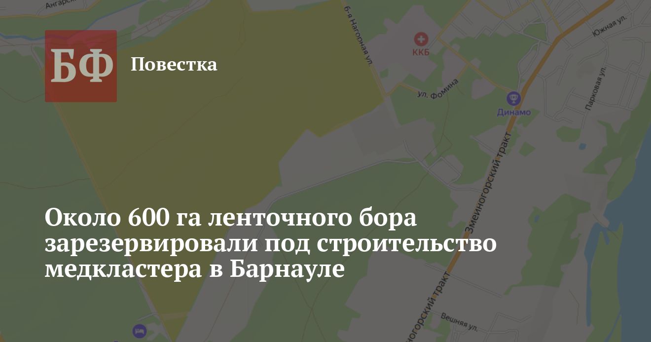 Правительство Алтайского края опубликовало постановление о резервировании земель в барнаульском ленточном бору для размещения объектов медицинского кластера и рекреации. В перечень земель входит 10 участков общей площадью около 600 га, следует из документа, который подписан губернатором Виктором Томенко 8 апреля.